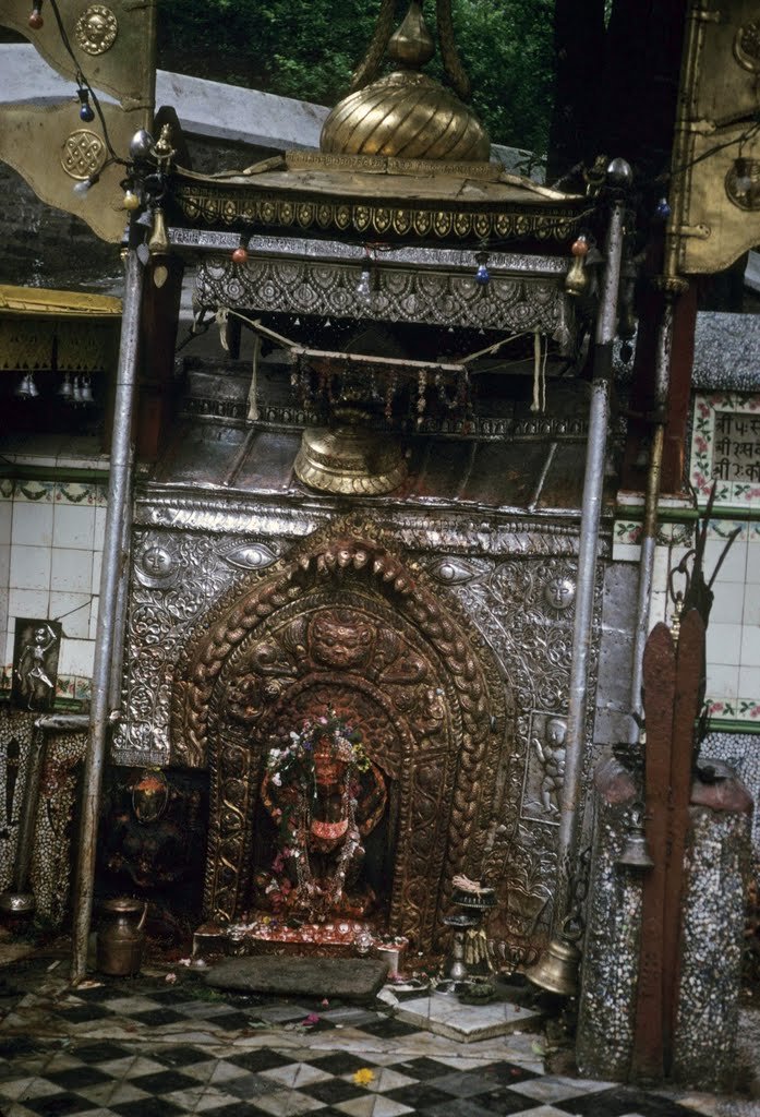 2. Golden Canopy: Above the black stone idol sits a beautifully crafted golden canopy (*Gajur*), symbolizing the royal patronage the temple has received over centuries.